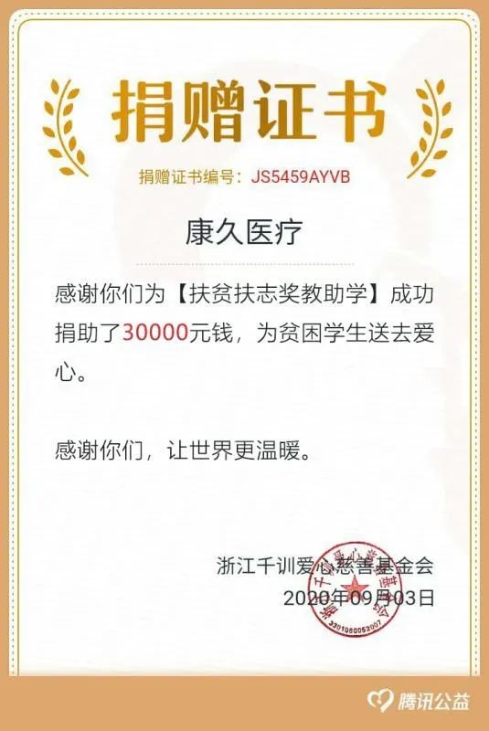 2020年是浙江省社會組織總會“打贏脫貧攻堅戰(zhàn)三年行動計劃”的收官之年,總會聯(lián)合騰訊公益、浙江千訓(xùn)愛心慈善基金會及國內(nèi)愛心企業(yè)共同發(fā)起“99公益日·扶貧扶志獎教助學(xué)”公益活動。康久醫(yī)療作為浙江省社會組織總會2019年執(zhí)行會長單位、社會服務(wù)機構(gòu)專委會主任委員單位,多年來一直與總會在公益之路上攜手同行。
