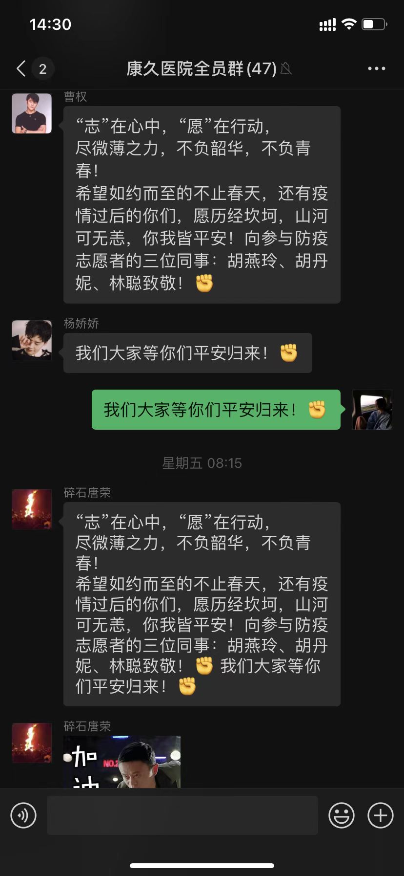 除了酒店里并肩作戰(zhàn)的戰(zhàn)友,在林聰、胡燕玲和胡丹妮的大后方——衢州康久醫(yī)院里,所有同事都不停地在線上為他們加油打氣。滿滿的正能量每天都在刷屏,鼓勵(lì)著前線的抗疫英雄。
