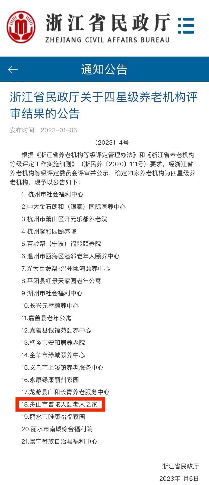 1月6日,浙江省民政廳發(fā)布《浙江省民政廳關(guān)于四星級(jí)養(yǎng)老機(jī)構(gòu)評(píng)審結(jié)果的公告》,康久集團(tuán)旗下舟山市普陀天頤老人之家獲評(píng)浙江省四星級(jí)養(yǎng)老機(jī)構(gòu)。