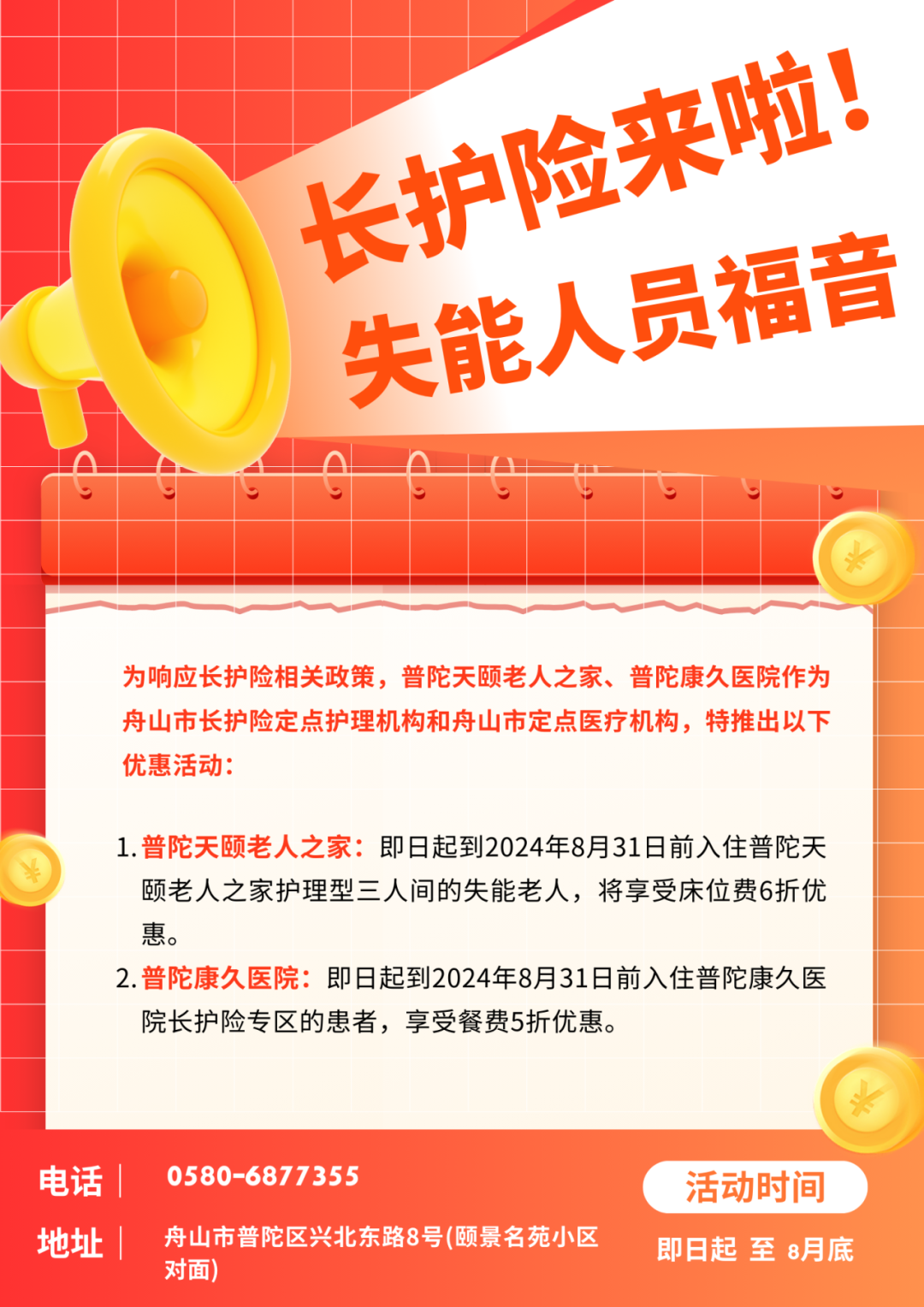 為更好地為舟山失能老人創(chuàng)造優(yōu)質(zhì)的護理服務(wù)體驗,普陀天頤老人之家、普陀康久醫(yī)院作為舟山市長護險定點護理機構(gòu)和舟山市定點醫(yī)療機構(gòu),即日起推出以下優(yōu)惠活動: