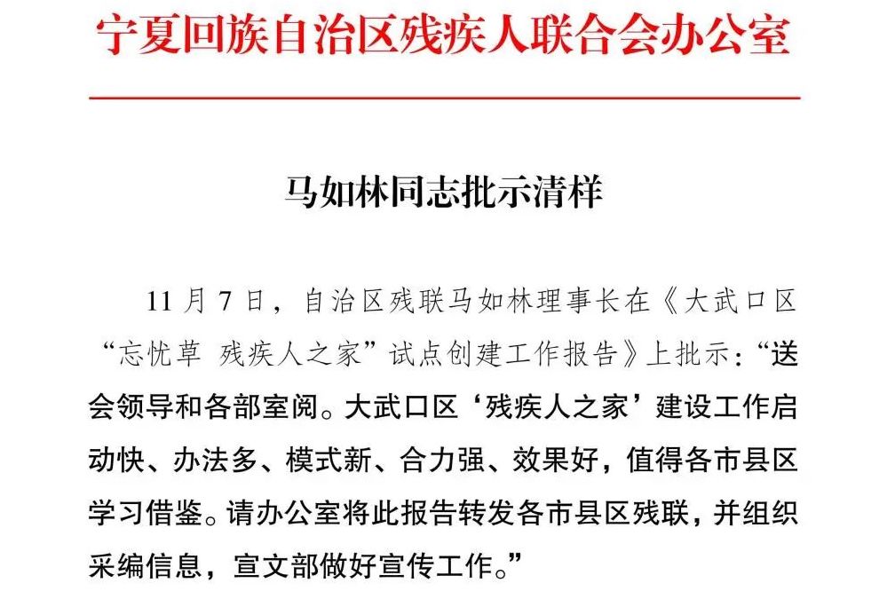 近日,寧夏回族自治區(qū)殘疾人聯(lián)合會(huì)辦公室發(fā)布馬如林理事長(zhǎng)對(duì)《大武口區(qū)“忘憂草·殘疾人之家”試點(diǎn)創(chuàng)建工作報(bào)告》的批示。馬如林…